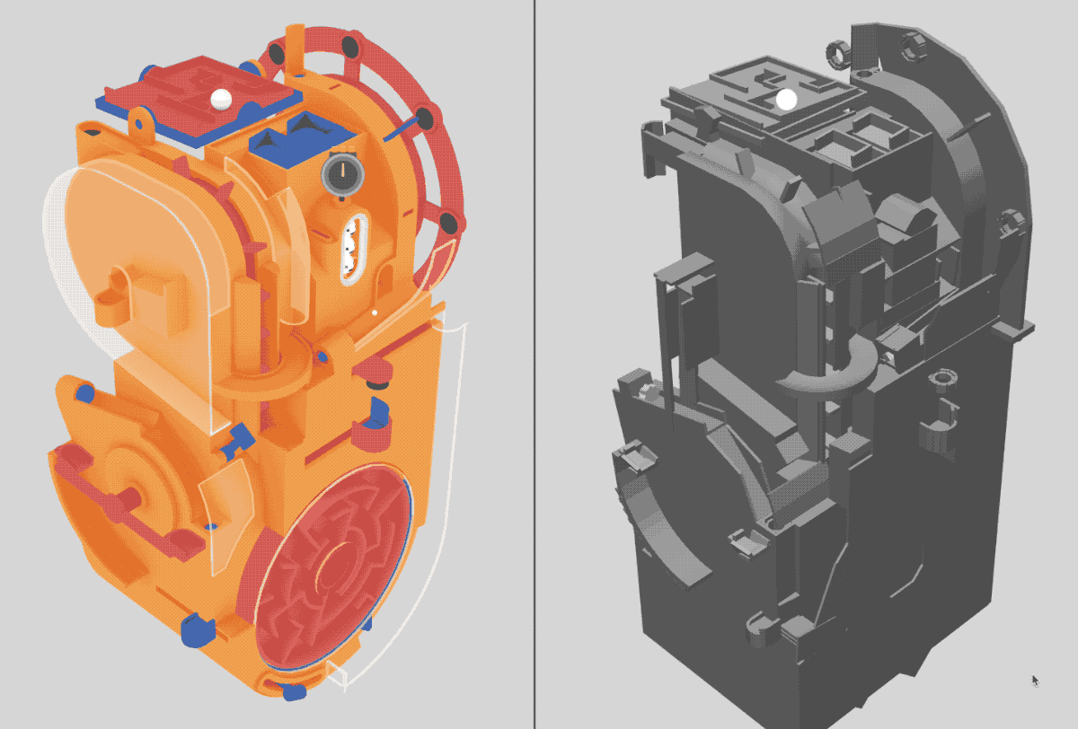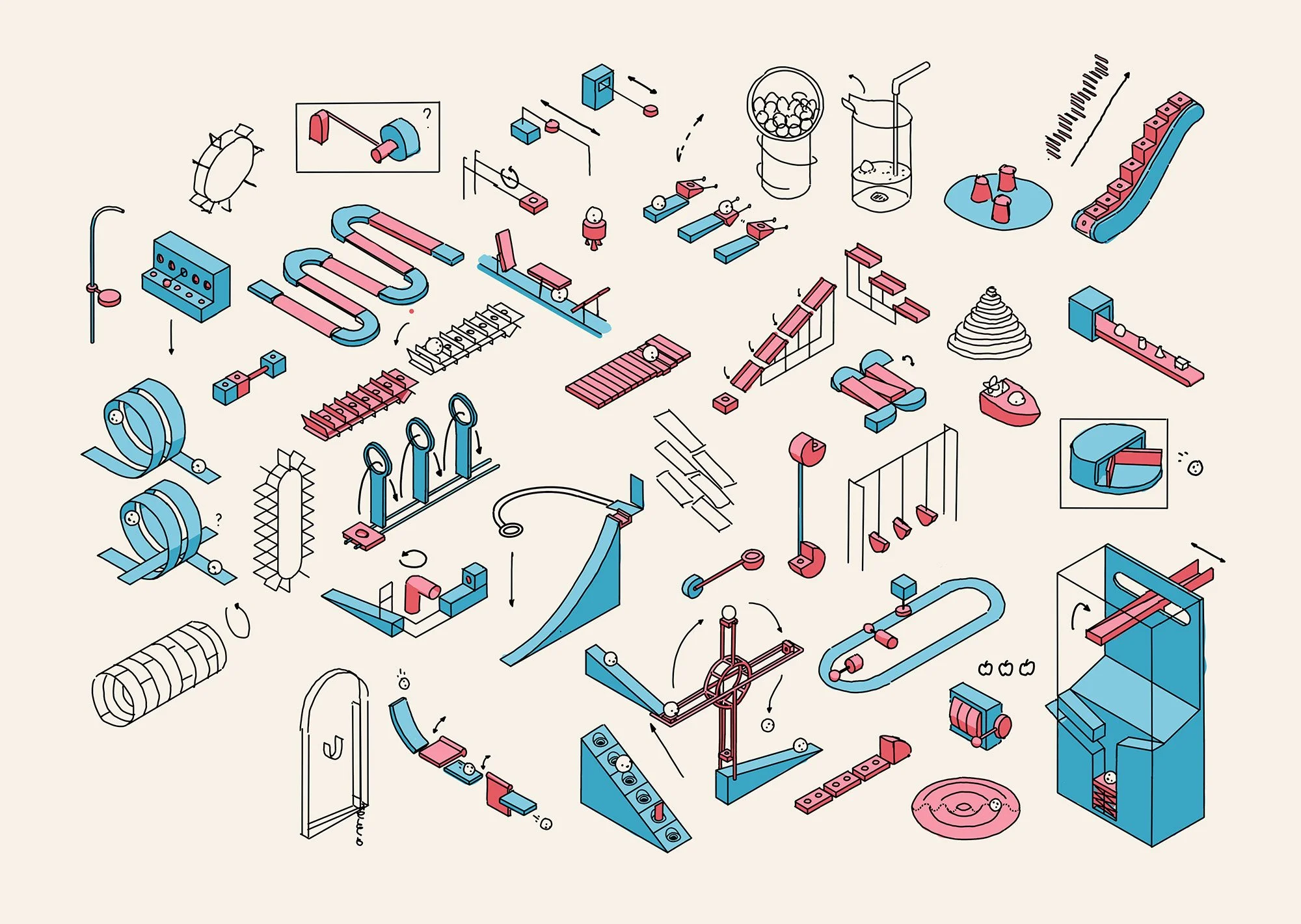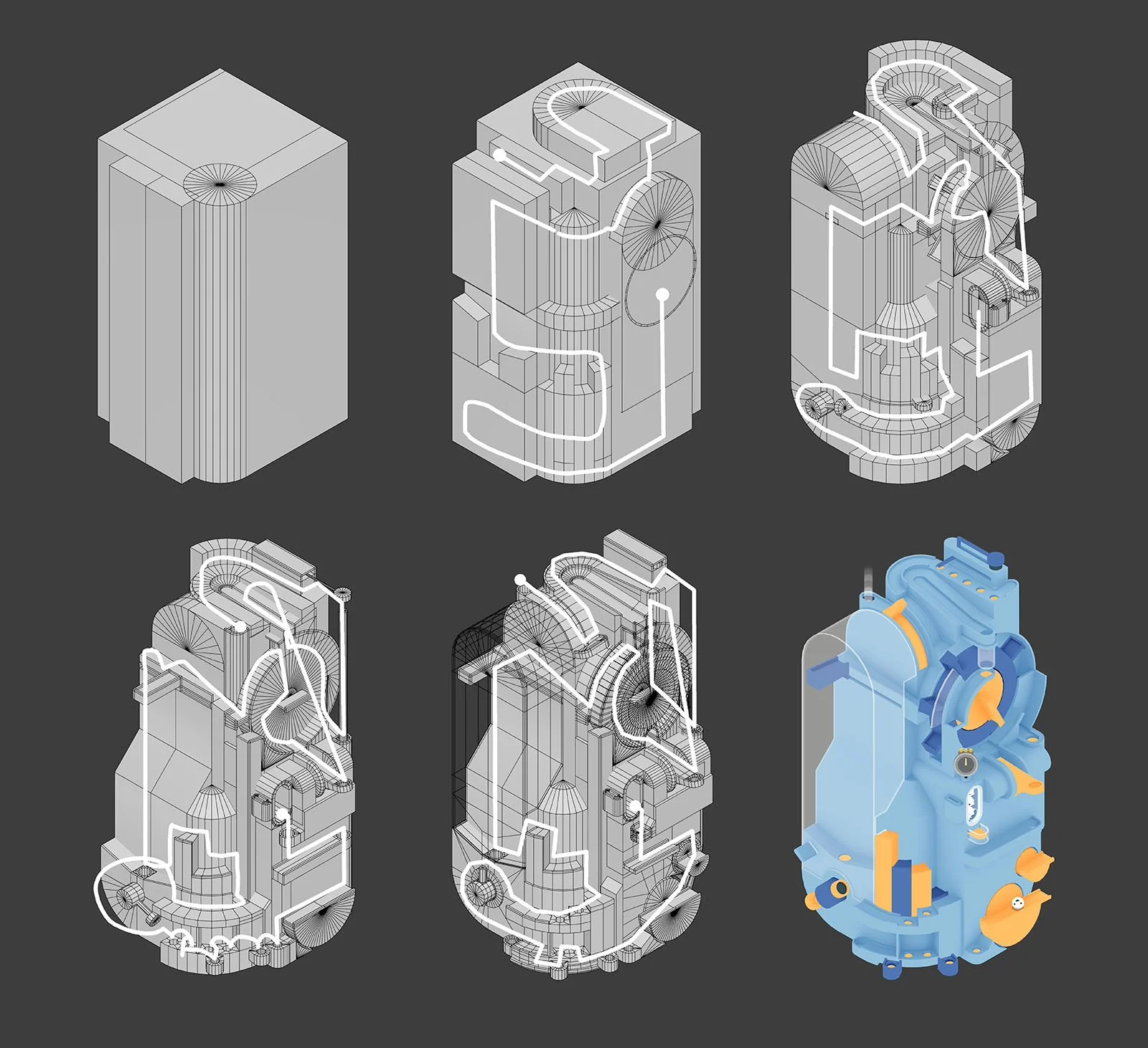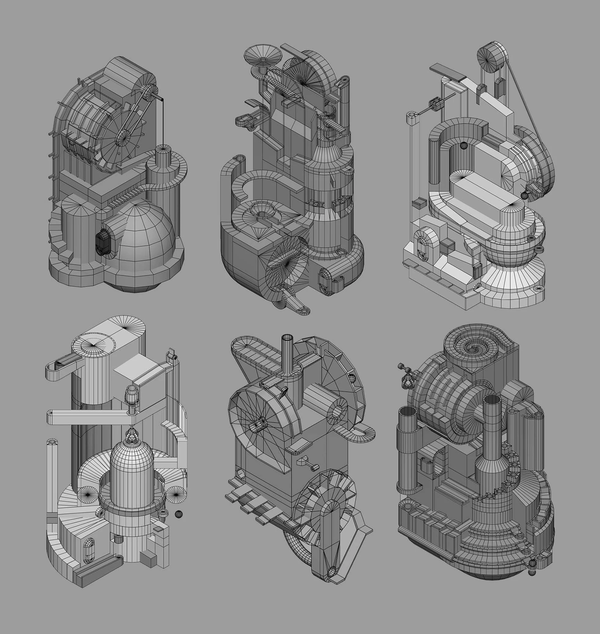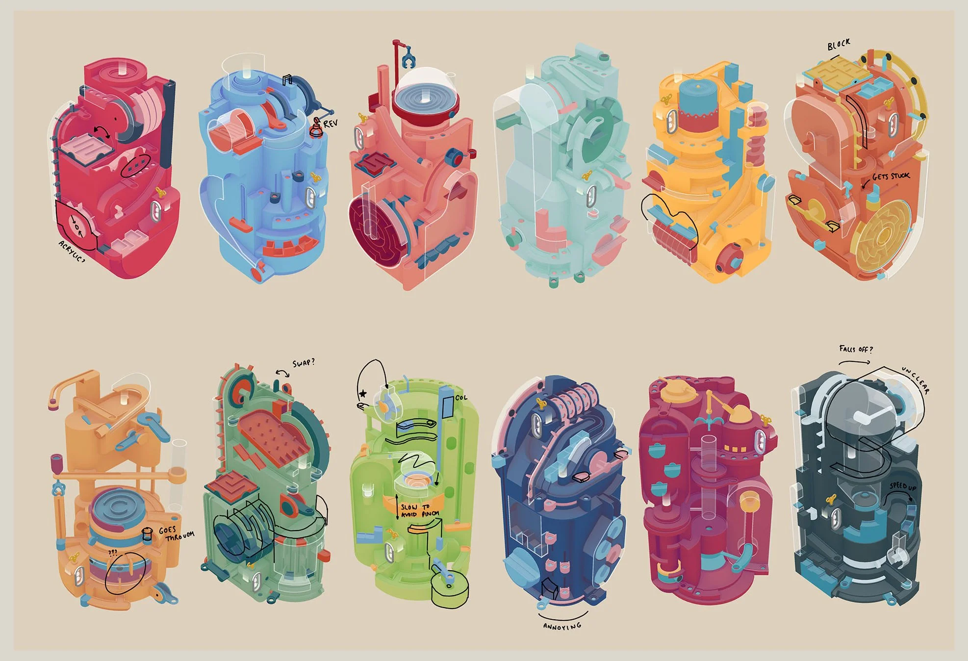 The general shape of each level is different, but the contraptions are often repeated. This saves time but also helps with visual consistency and establishes a common appearance across all levels, as though manufactured using the same moulds and parts.